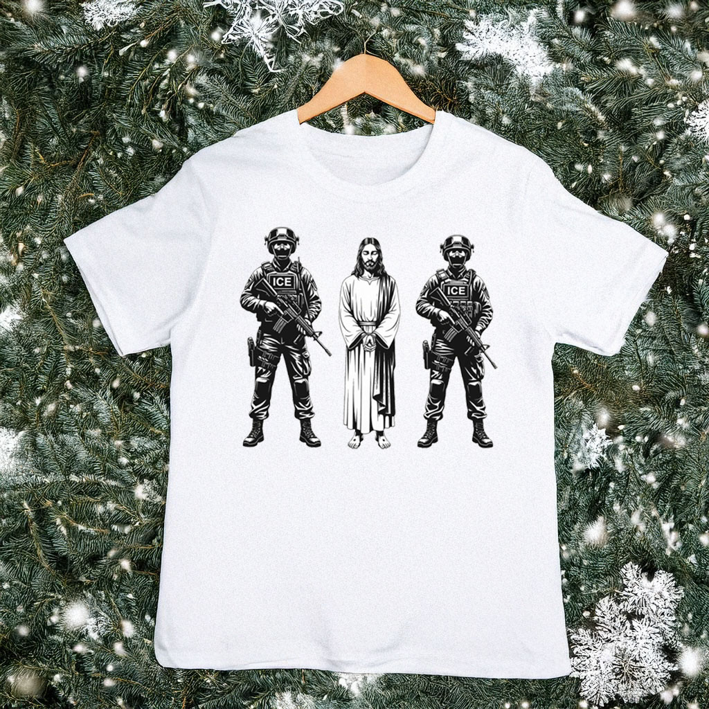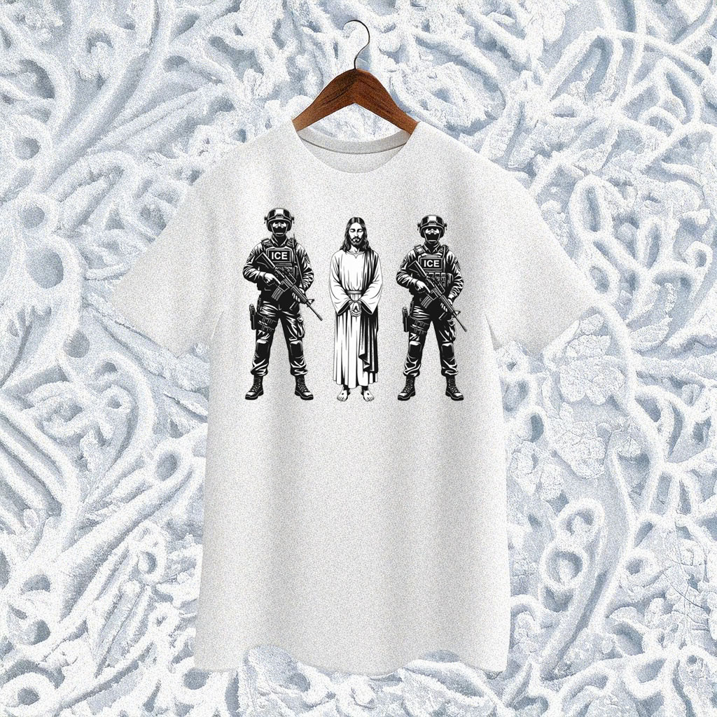 This shirt critiques policies and practices associated with U.S. Immigration and Customs Enforcement using satire and irony. The message targets systems and narratives, not individuals, and is intended for peaceful, expressive advocacy.